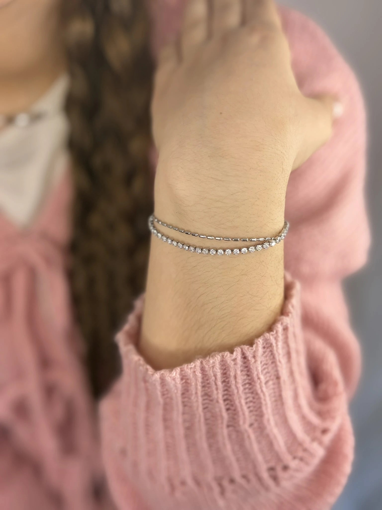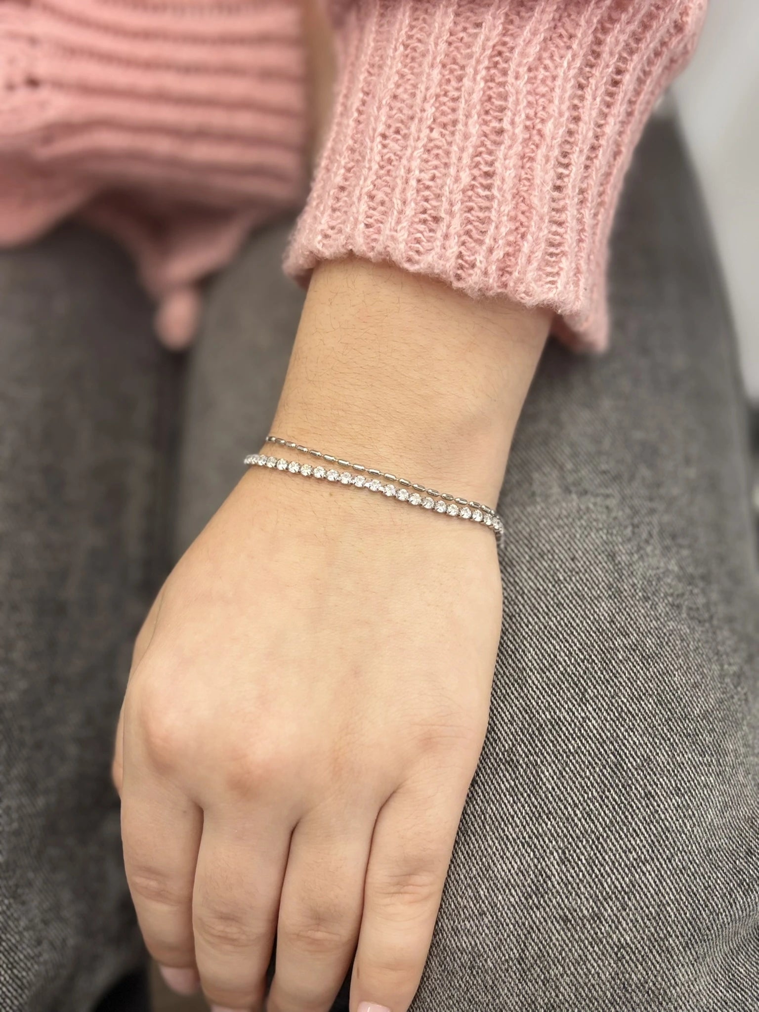 Épuré et lumineux, le bracelet Éclat d'Argent séduit par sa double chaîne argentée ponctuée de perles facettées qui captent la lumière. Minimaliste mais raffiné, il s’adapte à tous les styles et se porte aussi bien seul qu’en accumulation pour un effet plus audacieux. Un indispensable du quotidien.