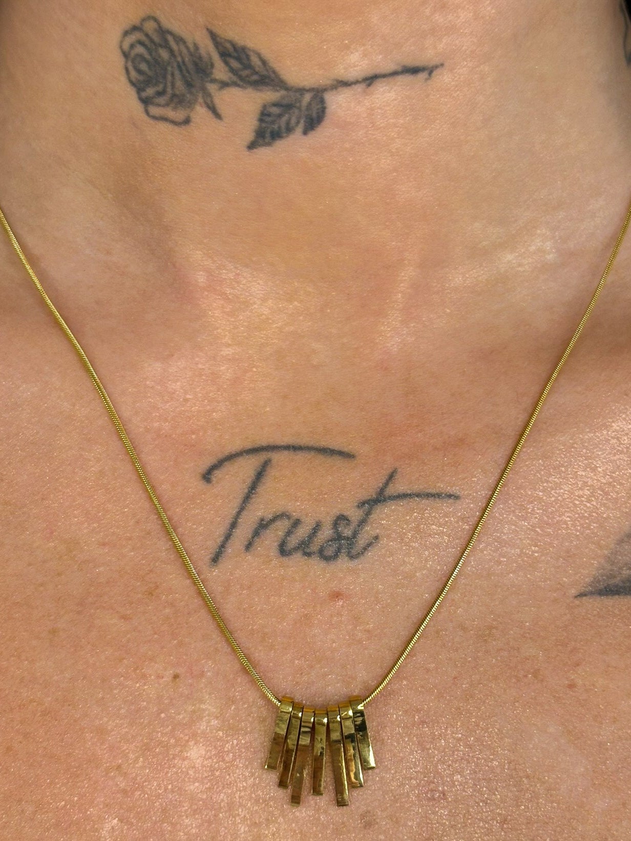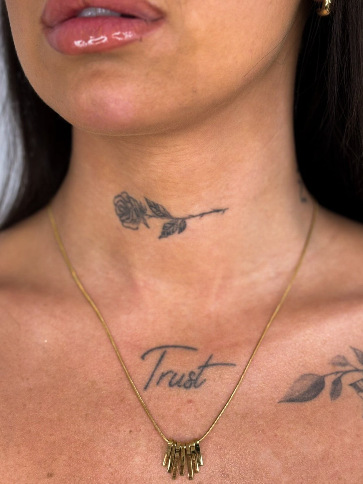 Élégant et contemporain, le collier Arpège dévoile une série de fines tiges dorées martelées, suspendues à une chaîne souple. Leur disposition évoque un motif en cascade qui capte la lumière à chaque mouvement, tel un rythme visuel inspiré d'une partition musicale. Idéal pour rehausser un look structuré ou apporter une note de caractère à une tenue épurée.