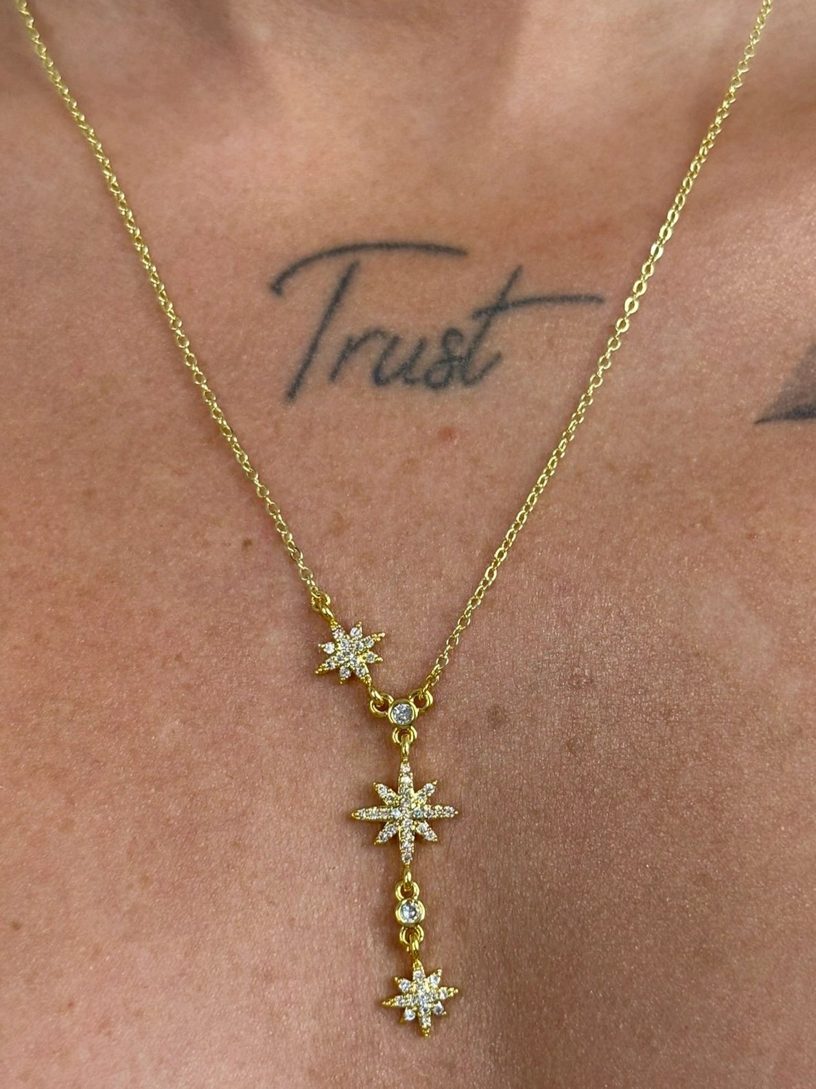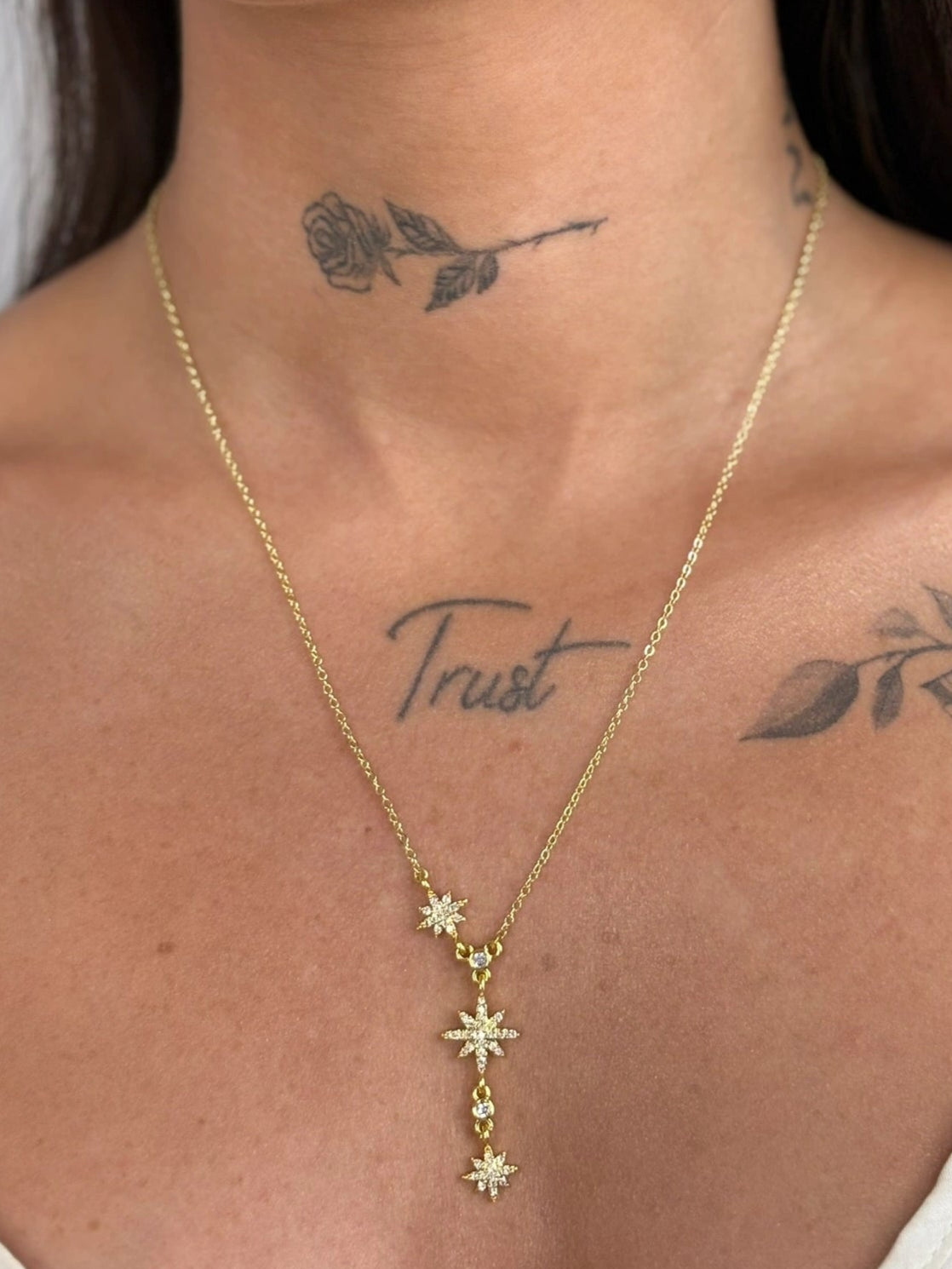 Le collier "Astra" célèbre la beauté céleste avec ses trois étoiles à huit branches finement serties de strass scintillants. Suspendues à une chaîne dorée élégante, ces étoiles capturent la lumière avec raffinement, apportant une touche d’éclat subtile à votre décolleté. Un bijou poétique et lumineux, parfait pour illuminer toutes vos tenues.