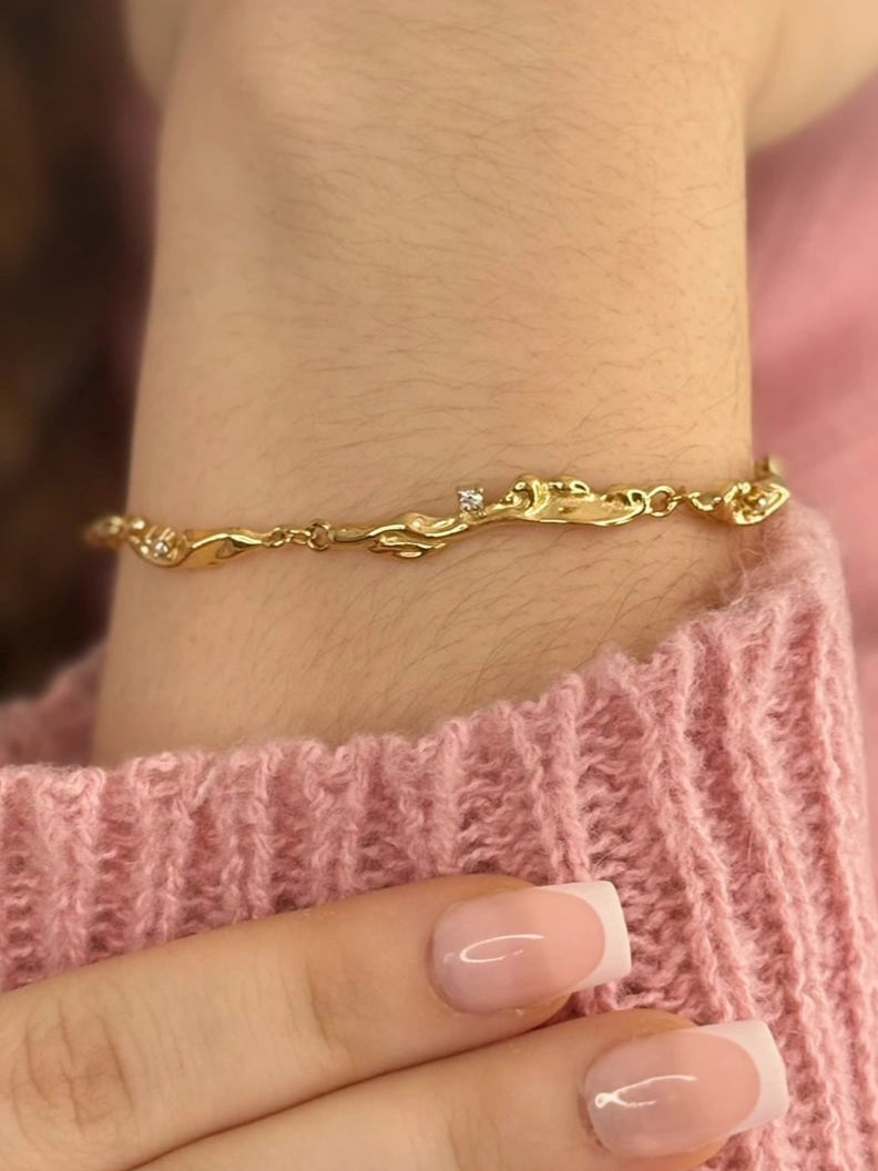 Inspiré par la nature, le bracelet Brindille évoque une branche dorée stylisée, délicatement ornée de petits strass scintillants. À la fois poétique et raffiné, ce bijou apporte une touche de lumière tout en subtilité, parfait pour celles qui aiment les détails fins et élégants.