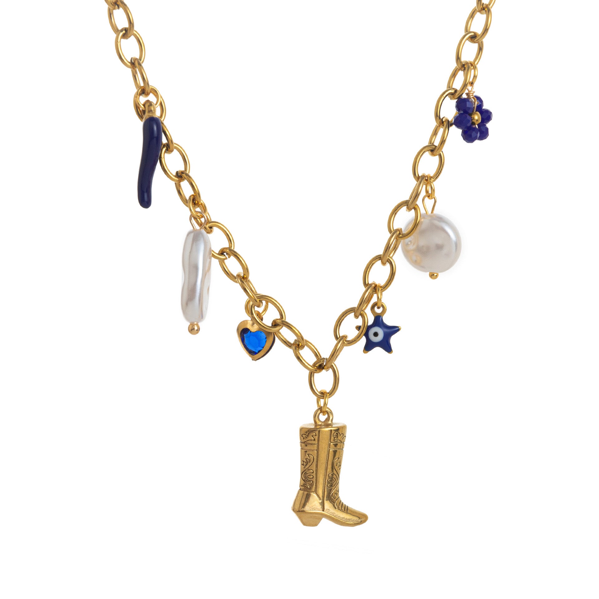 • Collier doré orné de pendentifs originaux : botte de cowboy gravée, étoile bleue, perles nacrées, cœur bleu et fleur délicate. Un bijou audacieux et bohème, qui apporte une touche western chic à vos tenues.