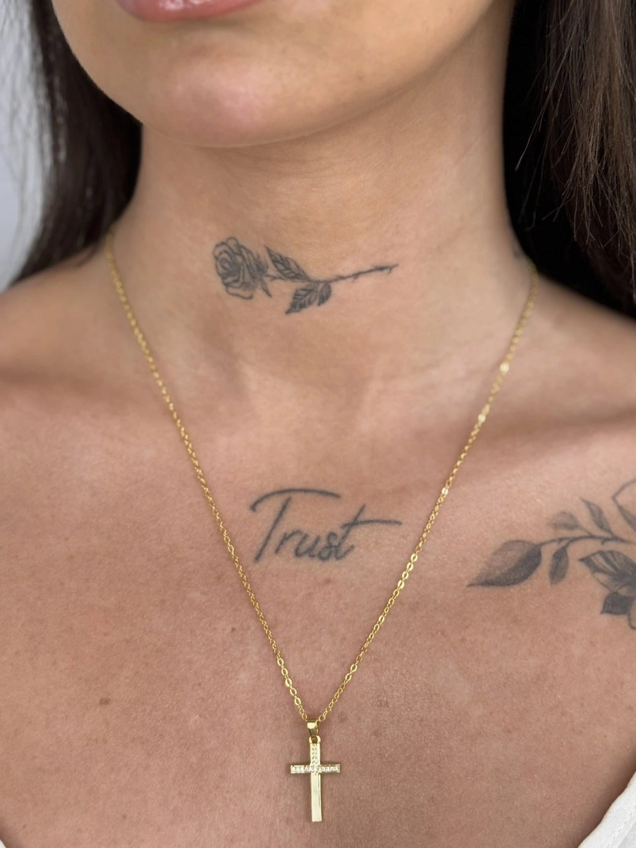 Le collier "Foi" est un symbole fort, à la fois moderne et lumineux. Sa croix dorée, délicatement incrustée de strass brillants, incarne une affirmation de style autant qu’un message personnel. Une pièce à porter au quotidien, entre élégance et spiritualité.