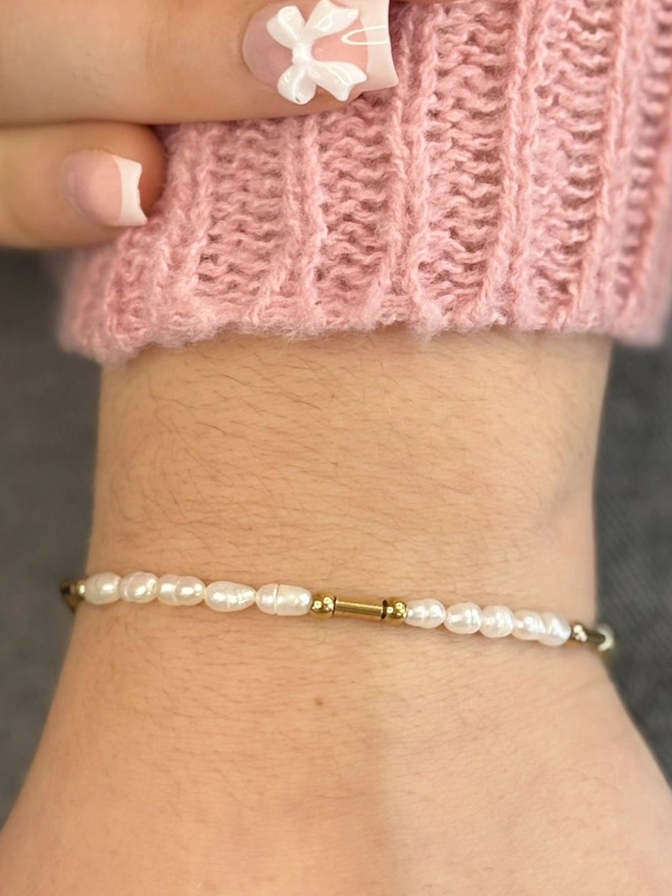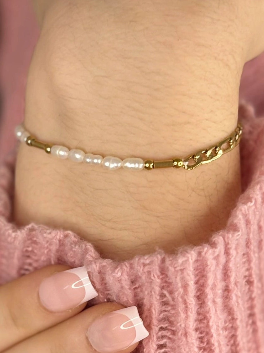 Le bracelet Demi-Lune joue sur les contrastes avec élégance. Son design asymétrique associe des perles allongées à une fine chaîne dorée, créant un équilibre subtil entre douceur nacrée et éclat métallique. Léger et raffiné, ce bijou original se porte aussi bien au quotidien que lors d'occasions spéciales.
