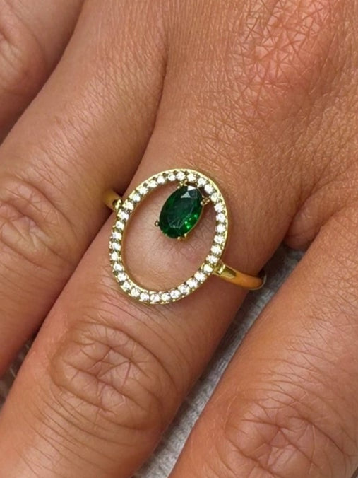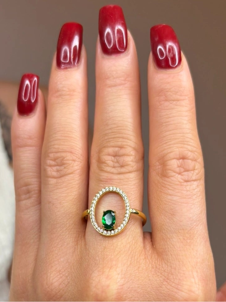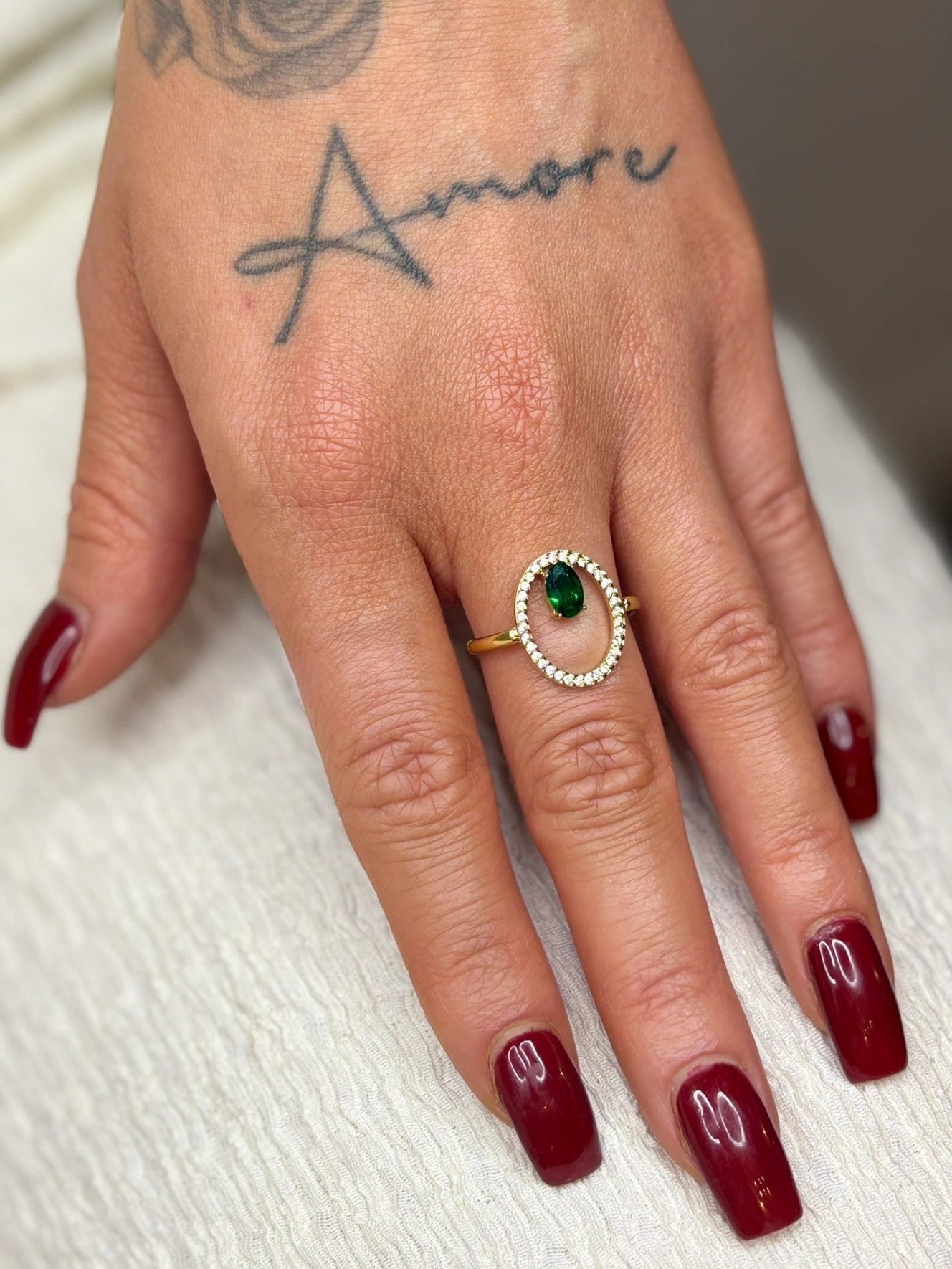 Élysée évoque la noblesse des pierres précieuses avec son cercle doré orné de zirconias clairs et son cabochon vert intense en son centre. Somptueuse et raffinée, cette bague apporte éclat et caractère, idéale pour sublimer vos mains avec élégance.