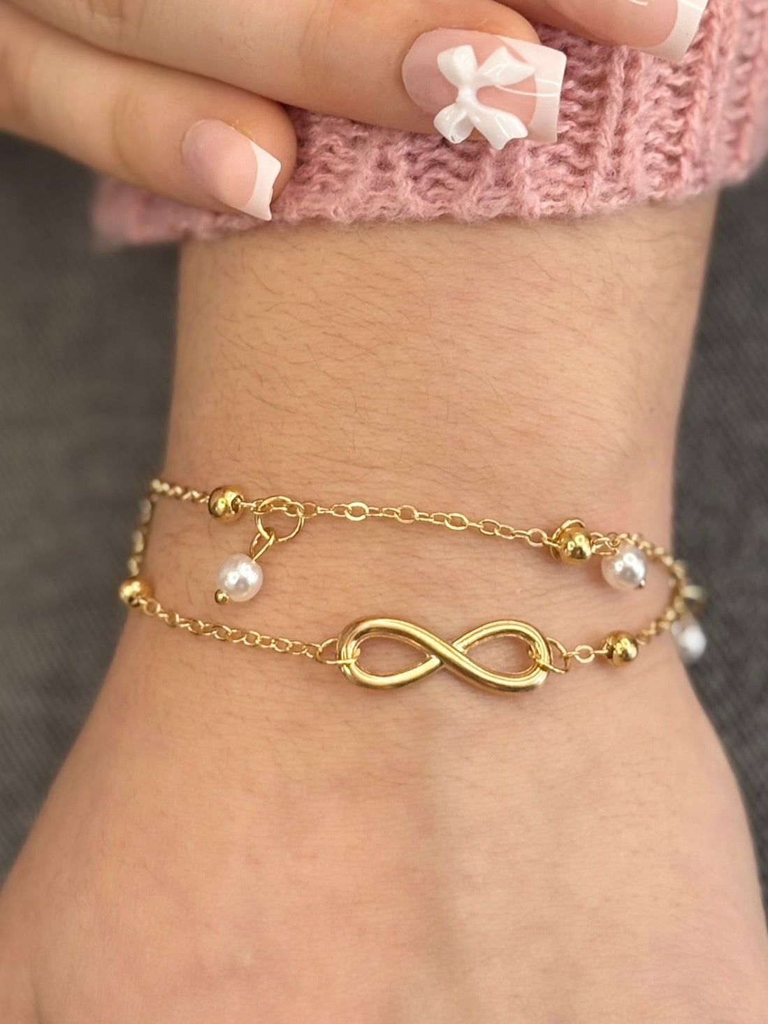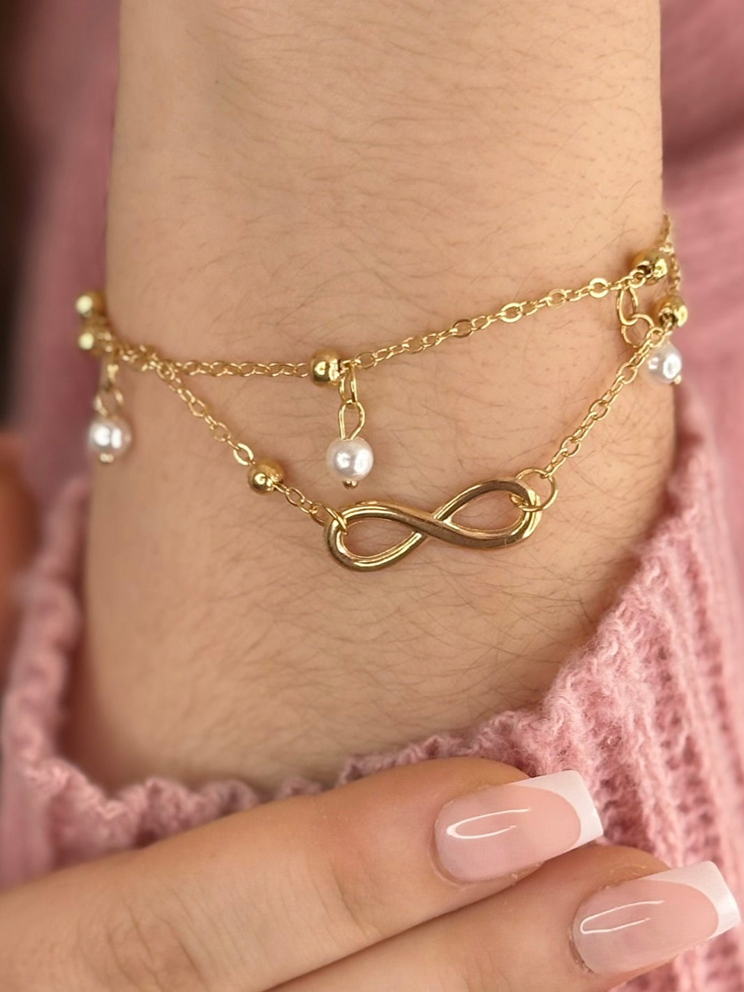 Le bracelet Éternité symbolise l’amour infini et l’élégance intemporelle. Ses deux chaînettes dorées, délicatement rehaussées de petites perles, se rejoignent autour d’un pendentif en forme d’infini orné d’une perle centrale. Ce bijou raffiné incarne la douceur et la féminité, et s’offre parfaitement comme preuve d’attachement ou comme touche précieuse du quotidien.