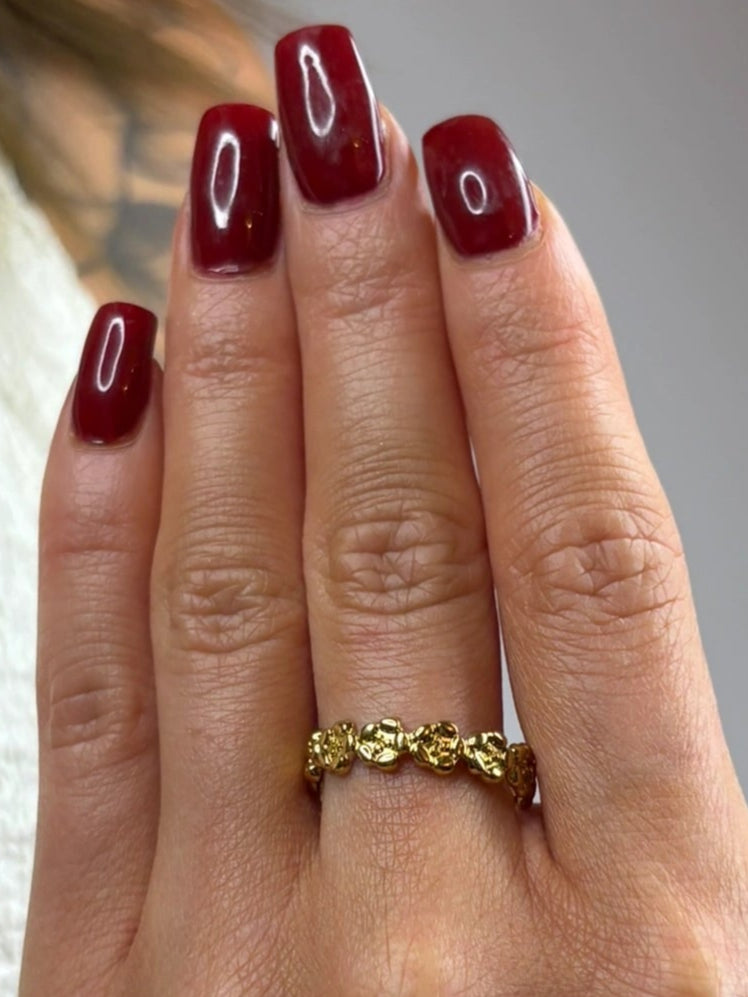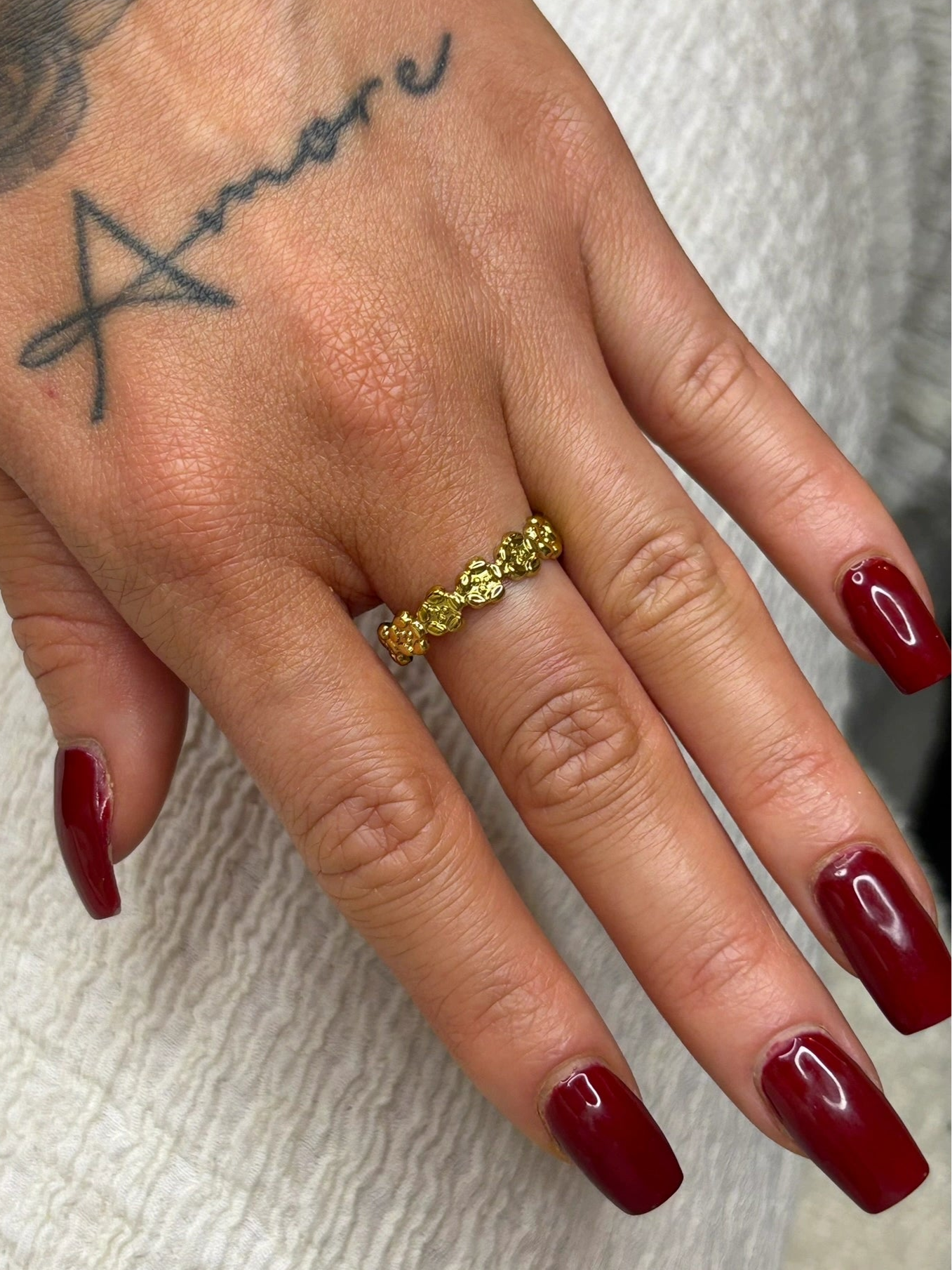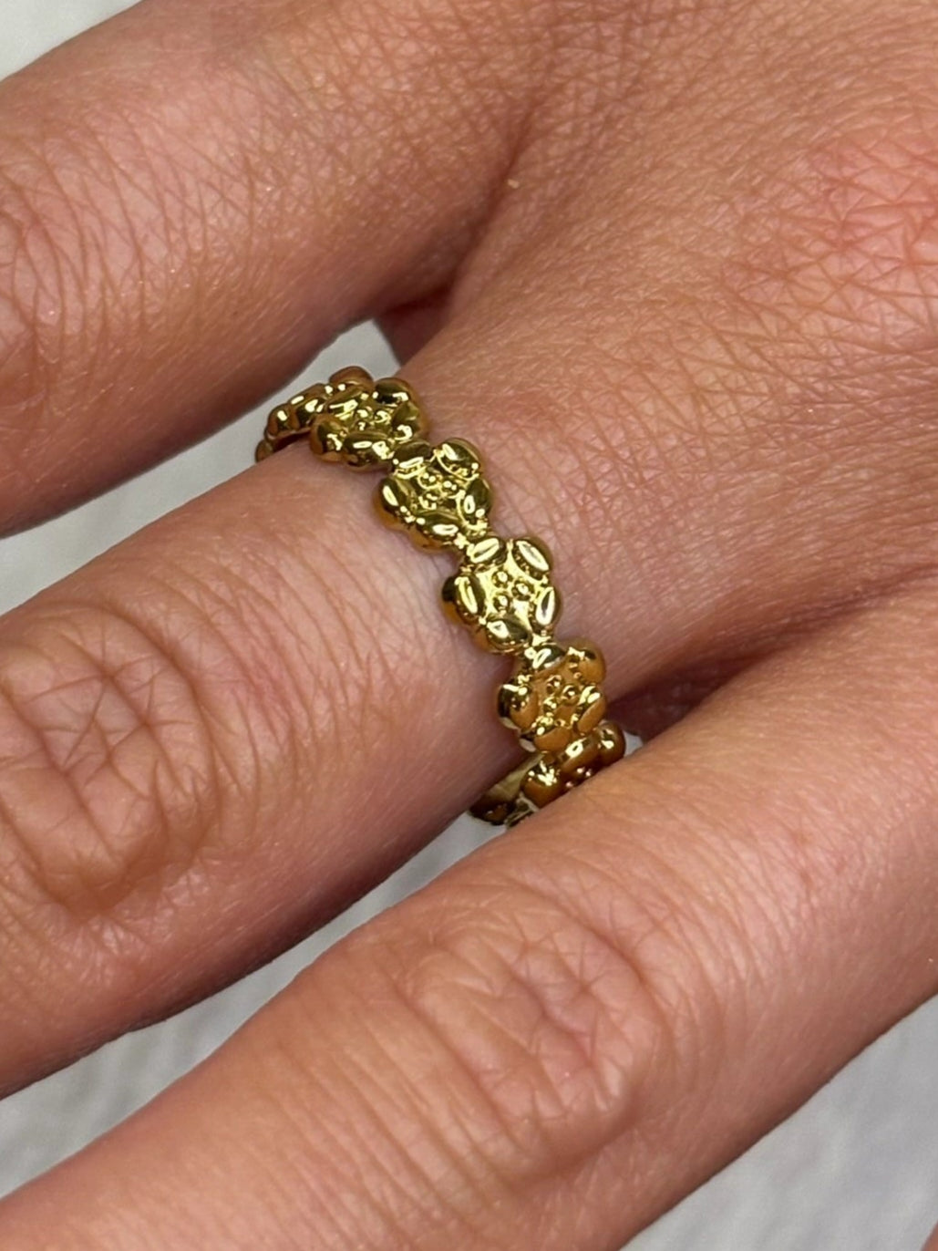 Ornée de délicates fleurs en relief, cette bague dorée adopte une forme irrégulière qui lui confère un style à la fois romantique et affirmé. Son design unique apporte une touche d’élégance vintage à vos tenues, idéale pour sublimer vos mains avec raffinement.