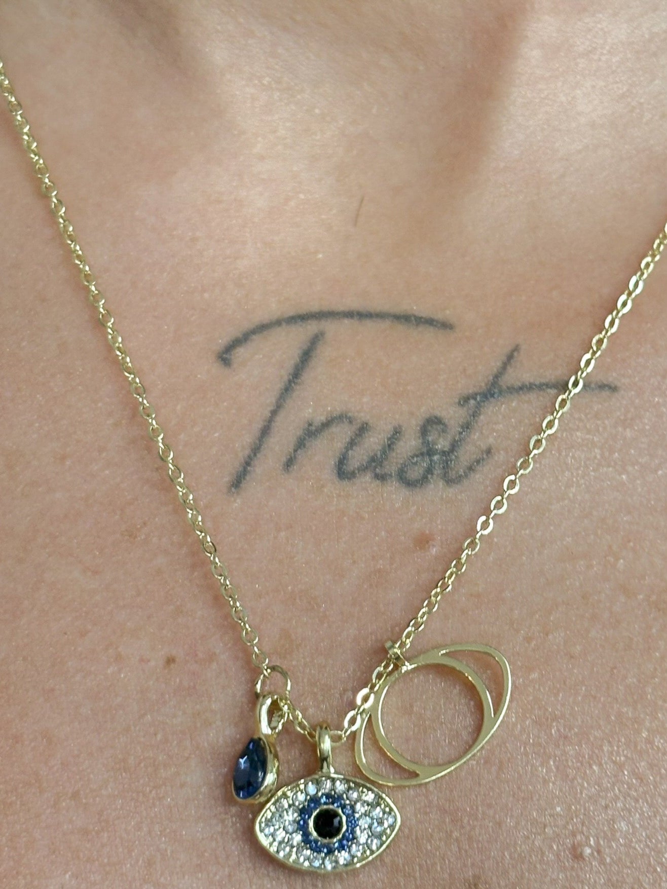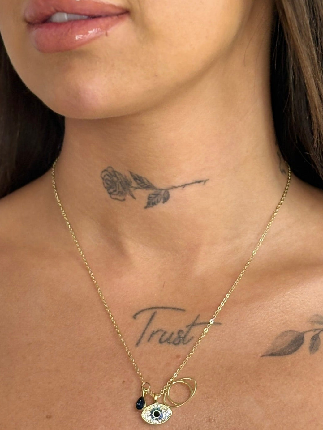 Évocateur et audacieux, le collier "Mystique" mêle symboles et élégance dans un design affirmé. Il se compose d’une chaîne dorée délicate ornée de trois pendentifs distinctifs : un œil protecteur scintillant de cristaux bleus, une goutte bleu nuit raffinée, et un anneau doré géométrique tout en subtilité. Une pièce à forte personnalité, qui habille le cou avec mystère et lumière.