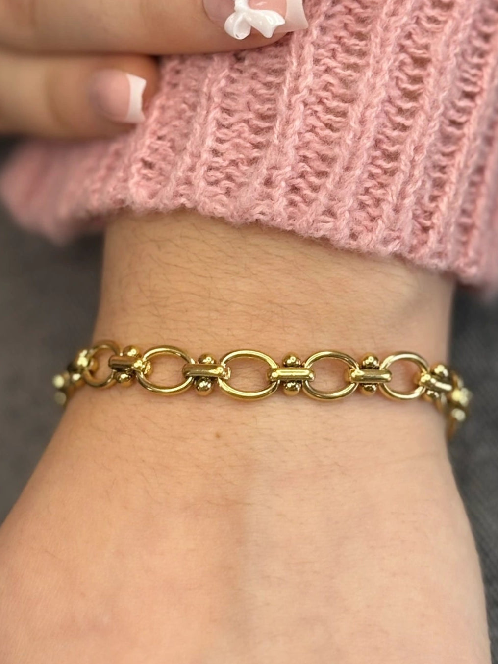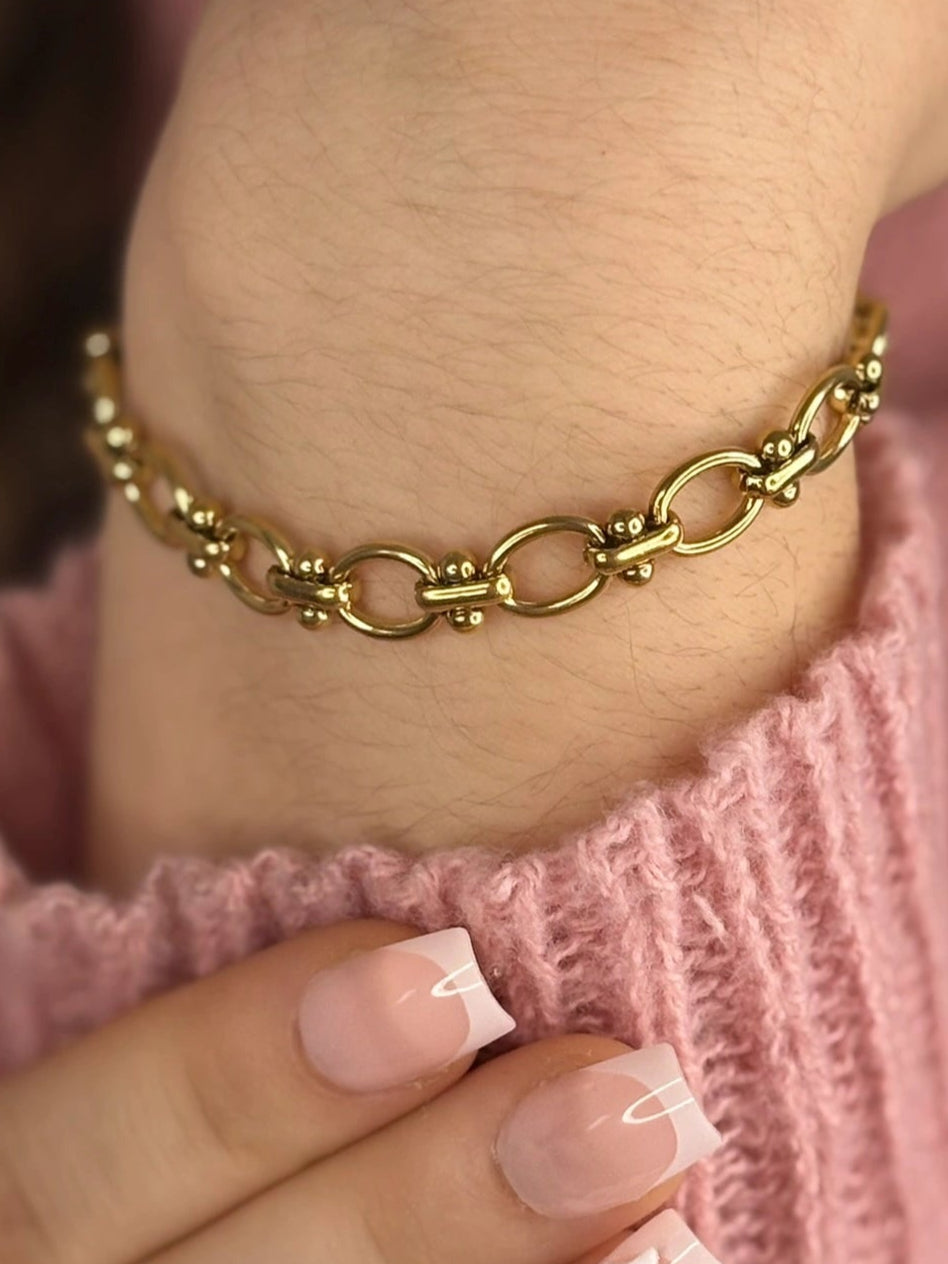 Le bracelet Orbite mêle originalité et structure grâce à ses maillons ovales élégamment ponctués de petites perles sphériques. Sa silhouette graphique en fait un accessoire moderne et affirmé, idéal pour sublimer une tenue avec caractère. Un bijou au design audacieux, parfait pour celles qui aiment se démarquer.