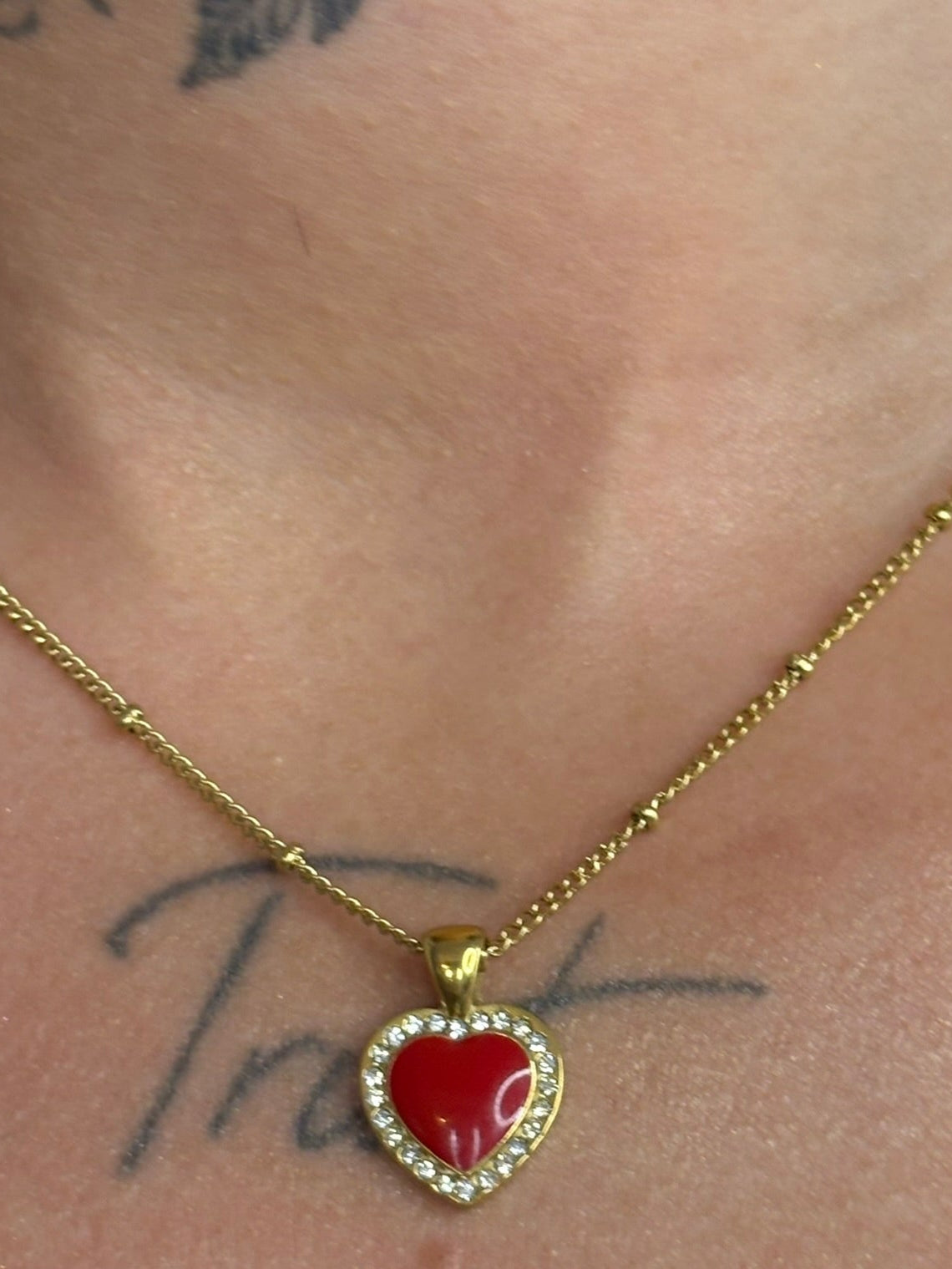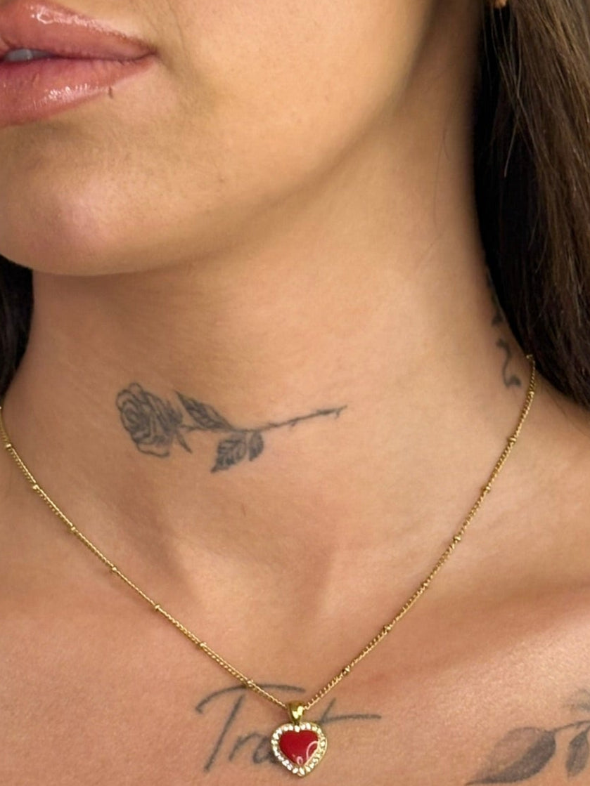 Déclaration audacieuse d’amour et de style, le collier Passion arbore un pendentif en forme de cœur rouge intense, serti de cristaux étincelants. Monté sur une chaîne dorée texturée élégante, il attire tous les regards et sublime le décolleté avec éclat. Une pièce symbolique et captivante, idéale pour affirmer sa féminité avec caractère.