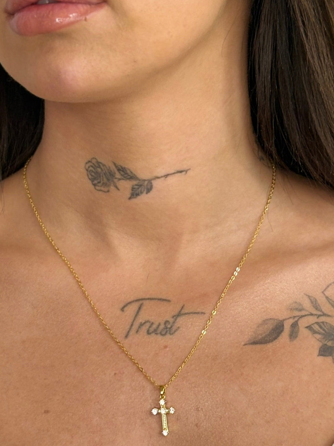 Le collier Celeste sublime le cou avec son pendentif en forme de croix finement travaillé, serti de cristaux lumineux. Monté sur une chaîne dorée élégante, il associe spiritualité et raffinement pour un rendu à la fois intemporel et tendance. Parfait seul ou en accumulation pour un look affirmé.