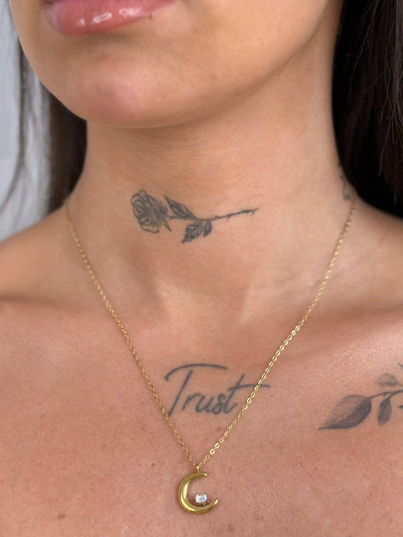 Mystique et féminin, le collier "Selenia" met en valeur un croissant de lune doré délicatement posé autour d’une pierre nacrée. Il évoque la douceur céleste et la puissance des astres, pour un style rêveur et poétique. Une pièce idéale pour les âmes connectées à la lumière lunaire.