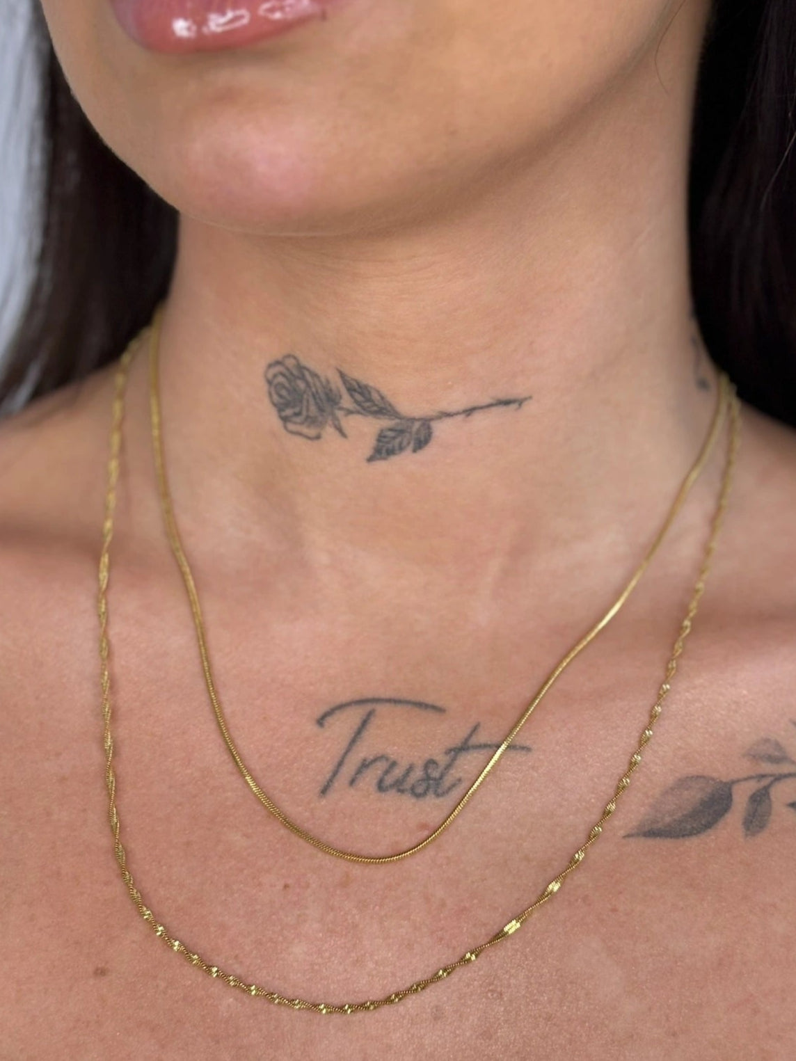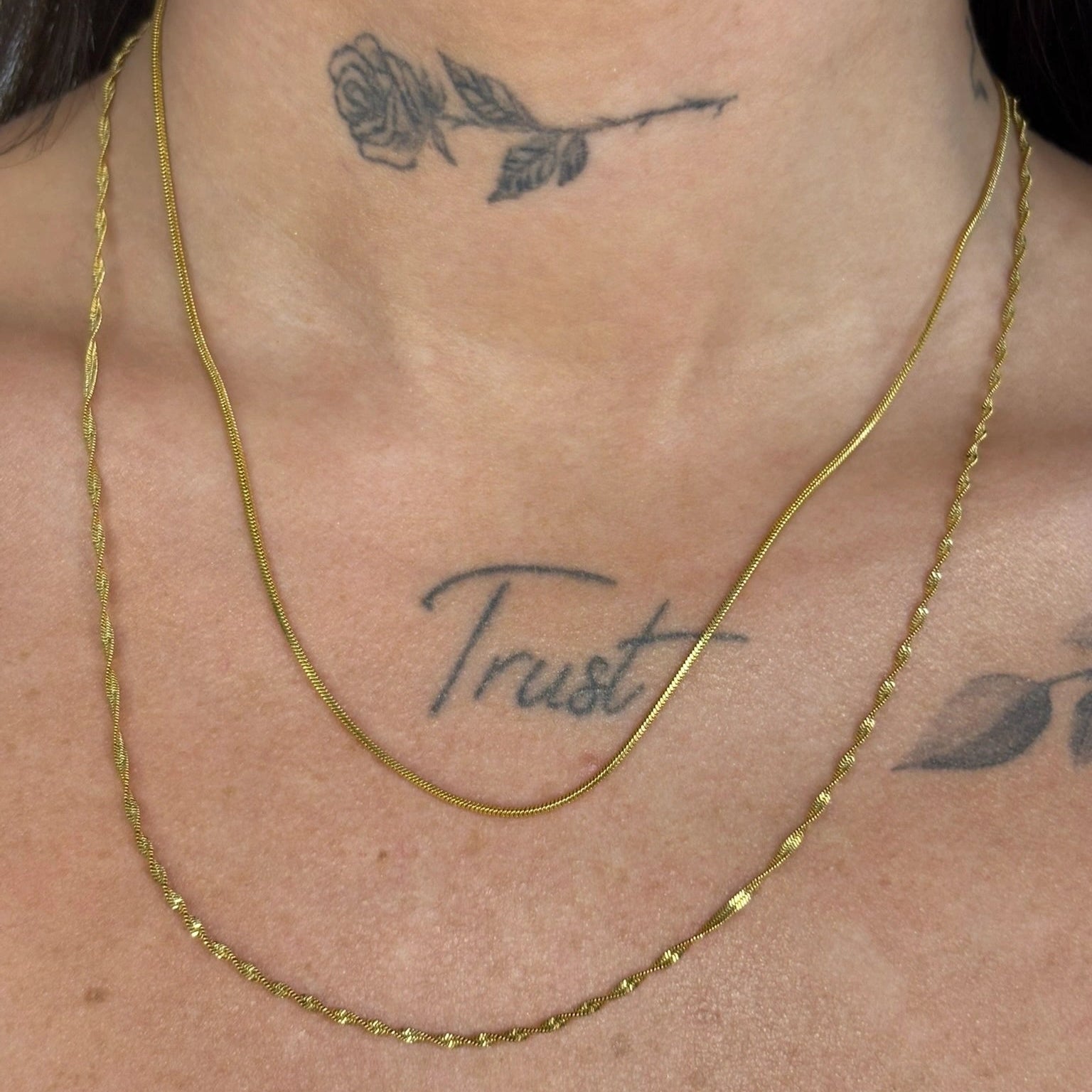 Le collier "Toscane" joue sur les contrastes subtils en unissant deux types de mailles dorées : une chaîne lisse et une torsadée. Ce design à la fois moderne et sophistiqué offre une présence élégante, qu’il soit porté seul ou en superposition. Un incontournable pour un style chic et affirmé.