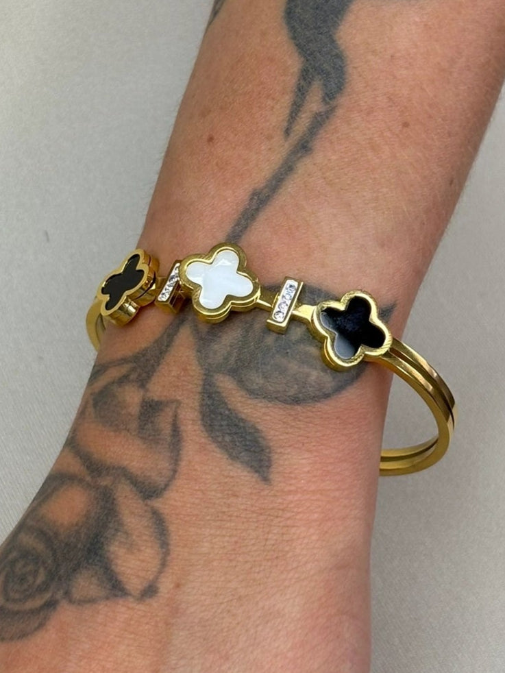Ce bracelet rigide en acier doré se distingue par son jeu d’alternance entre trèfles noirs et nacrés, créant un contraste raffiné et élégant. À la fois moderne et intemporel, il apporte une touche affirmée à vos tenues, qu’elles soient chics ou décontractées. Une pièce symbolique et sophistiquée qui incarne l’élégance féminine