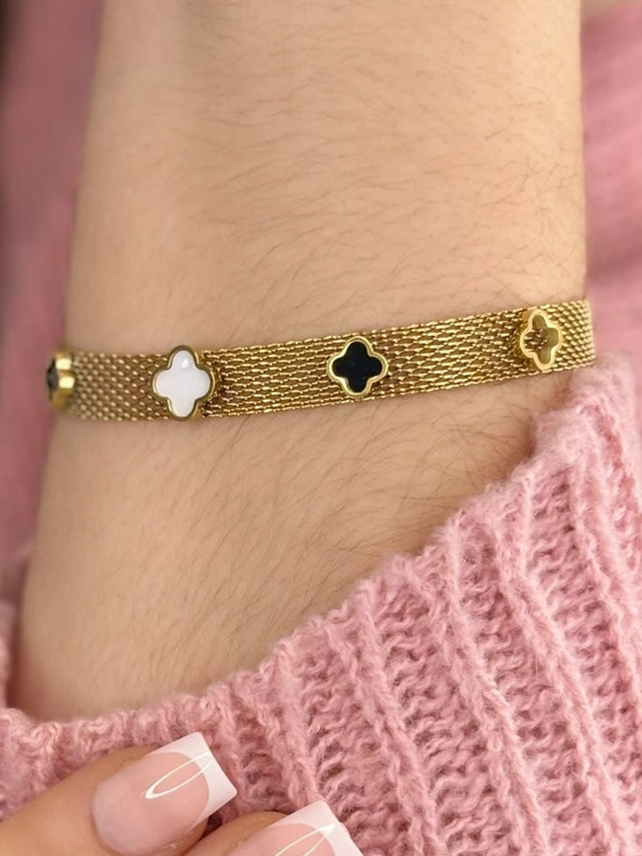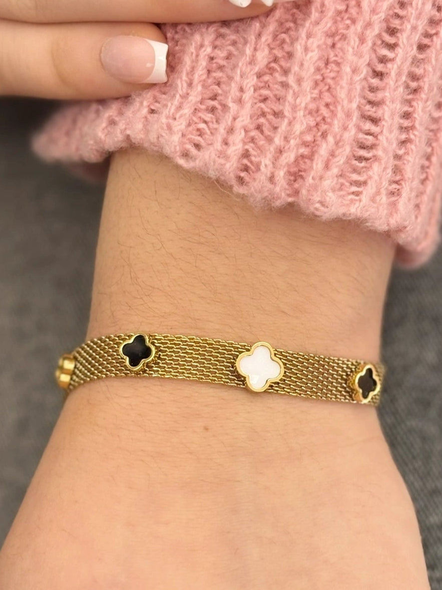 Le bracelet Trèfles Élégants mêle charme et symbolique avec ses trèfles émaillés noirs et blancs sur une maille dorée délicate. Porte-bonheur stylé, il apporte une touche chic à toutes vos tenues. Son design raffiné et sa facilité d’ajustement en font un bijou à la fois pratique et élégant.